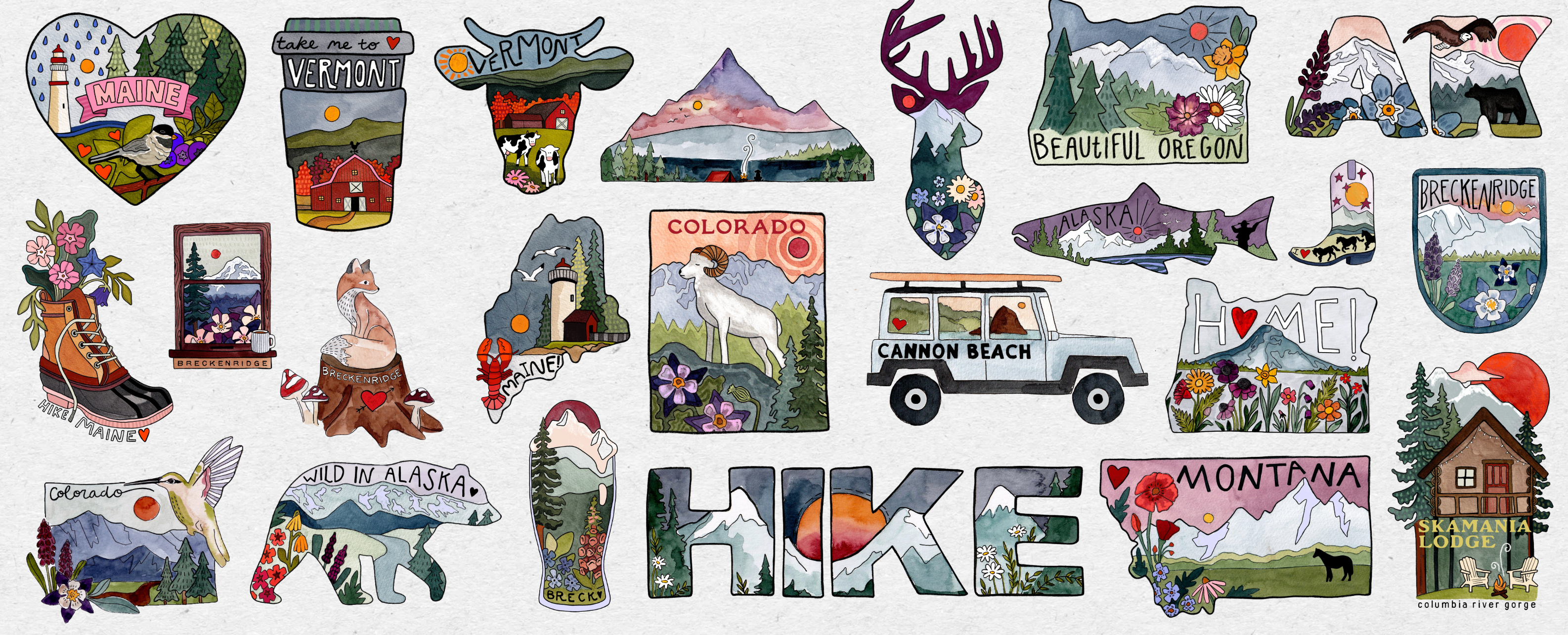 This portfolio is a collection of work I’ve created with clients ranging from commissioned tattoos and logo design to merchandise and custom illustrations. Every piece is done by hand using watercolor paints and digital techniques. My work is bright, whimsical, and represents the spirit of adventure, storytelling, and everyday beauty. Each design is meant to capture a sense of wonder—whether it’s a keepsake tattoo, a brand brought to life, or art that travels on stickers and merchandise.